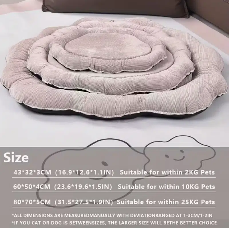 | Sizes | 43×32×3 cm (up to 2 kg pets) / 60×50×4 cm (up to 10 kg) / 80×70×5 cm (up to 25 kg) |
