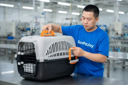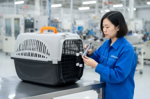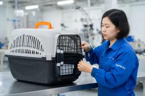 This is our comprehensive quality control inspection, including dimensional verification and door alignment testing on the finished plane dog carrier, to ensure precision and reliability for wholesale distribution.