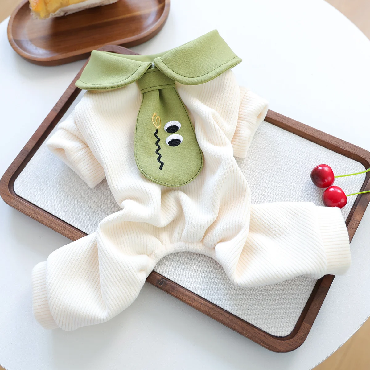This puppy dog onesie is a rib knit polyester pet garment constructed in cream with an oversize green doll collar and integrated cartoon embroidered tie. It serves wholesalers, pet stores, ecommerce sellers, and brand developers requiring consistent stock for small pet apparel categories. The construction supports business objectives through reliable performance that contributes to inventory efficiency, reduced replacement needs, and enhanced product lines that align with retail buyer preferences for functional pet clothing.