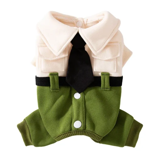 This is our charming gentleman-style dog onesie. It features a soft cream-colored top with a classic wide collar, chest pockets, and a stylish black tie, paired with a green bottom section designed like trousers with white buttons and a matching black belt for a dapper, formal look. Perfect for your furry friend to dress up in elegant style. And the best part is we can customize this style with different colors, fabrics, or special details to suit your preferences exactly.