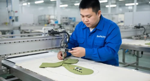 This is our automated precision cutting station where skilled technicians accurately cut fabric patterns for the puppy dog onesie ensuring dimensional consistency and strict tolerances that support reliable sizing across all wholesale orders.