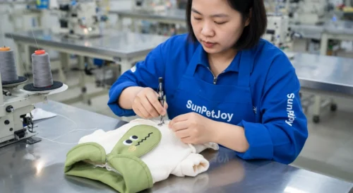 Final stages include comprehensive inspection under standardized lighting and measurement protocols to verify seam integrity collar alignment and embroidery placement before labeling and folding into protective packaging. The production line configuration accommodates both dedicated runs and mixed equipment setups which allows flexibility when adjusting output volumes to match buyer demand fluctuations. This controlled approach delivers batch uniformity that strengthens trust in ongoing procurement relationships for pet apparel businesses.