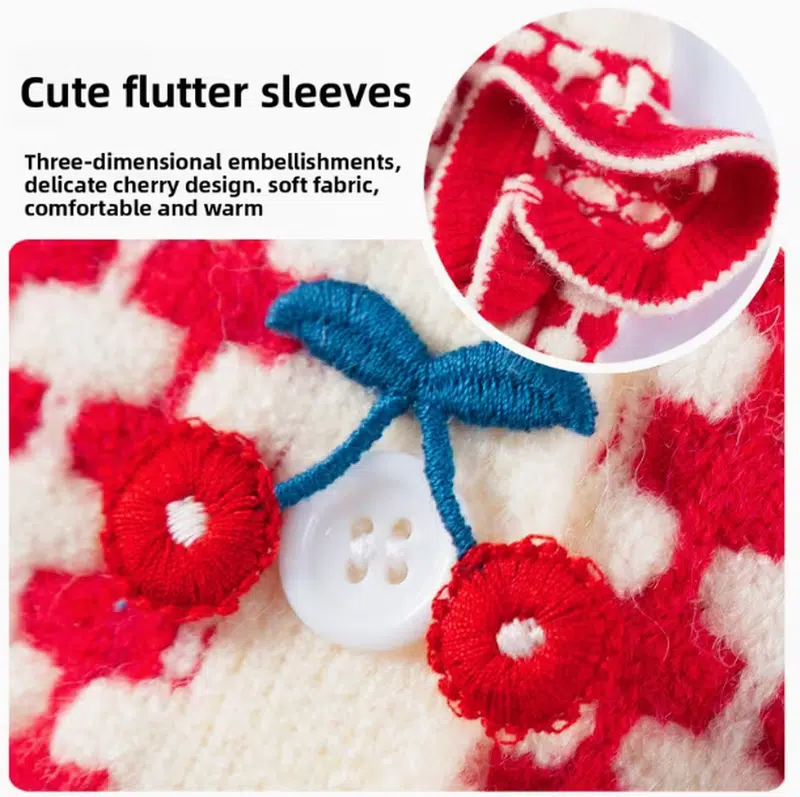 | Design Highlights | Red/cream plaid knit, flutter sleeves, 3D cherry decorations |