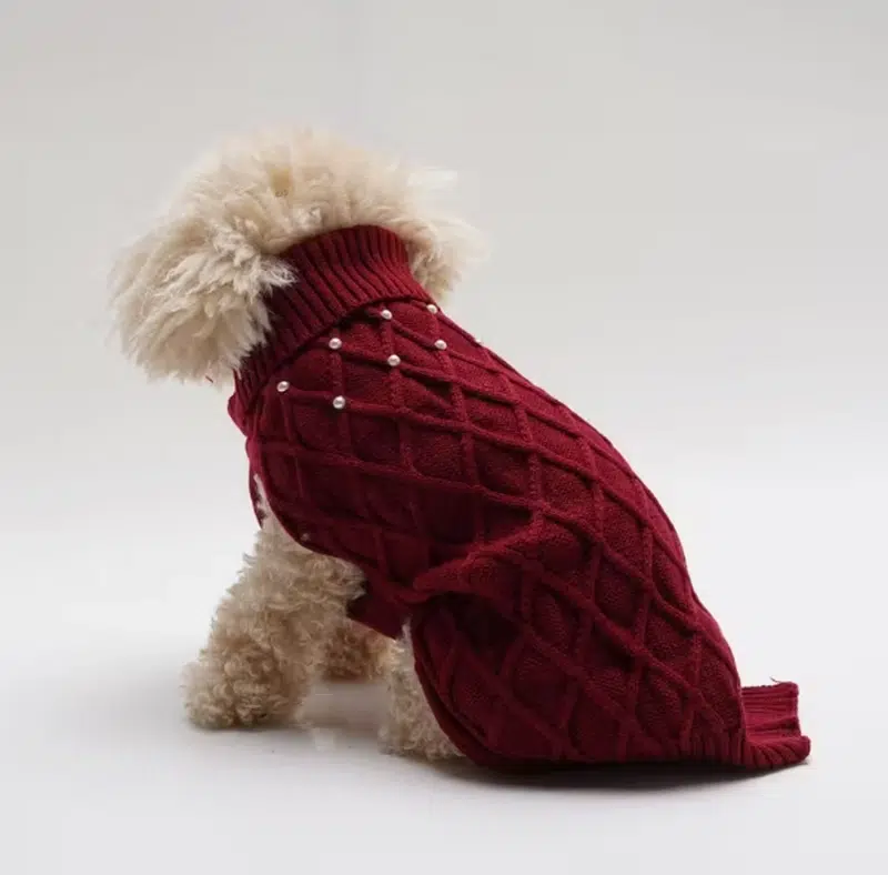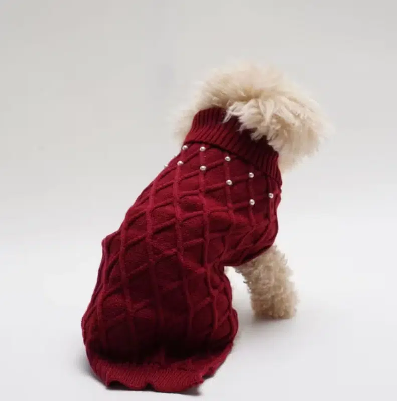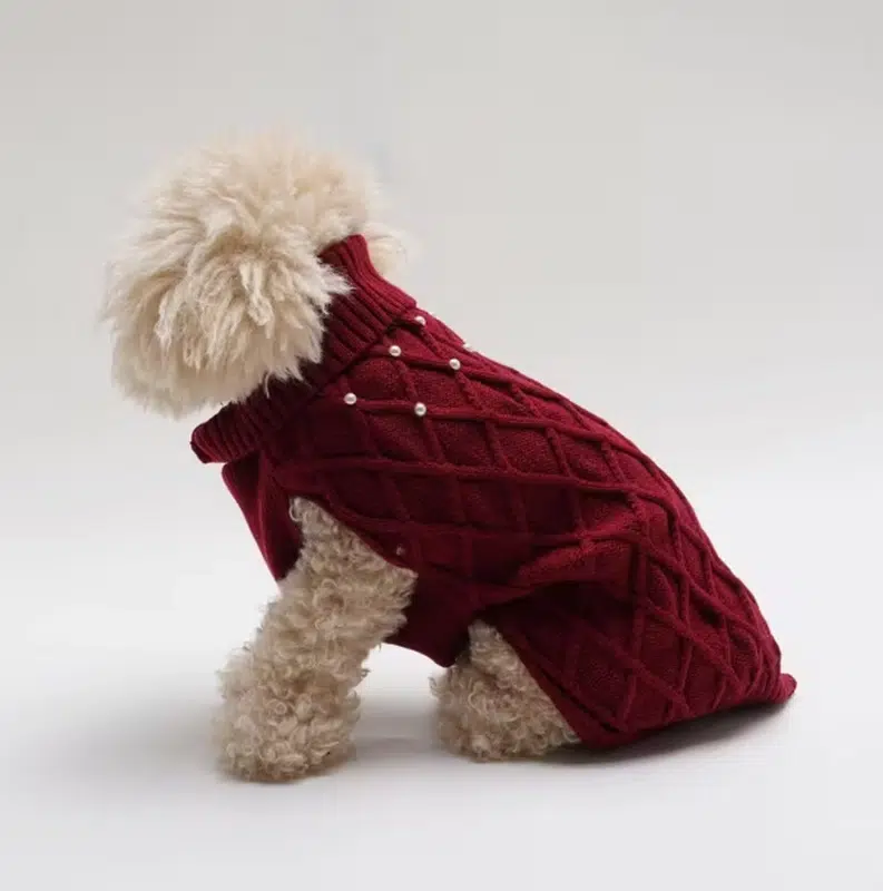Compared with plain knit petwear, this red dog sweater has stronger thumbnail appeal and better gift positioning. The textured surface helps it stand out in product photos, while the pullover structure keeps the look clean and premium. It is especially suitable for autumn and winter collections, holiday edits, boutique shelves, pet fashion stores, online marketplaces, and private-label knitwear programs aimed at toy breeds, small dogs, and selected medium-size dogs. This makes it a practical option for buyers searching for a red dog sweater with pearls, a turtleneck dog sweater, or a winter dog sweater for small dogs.