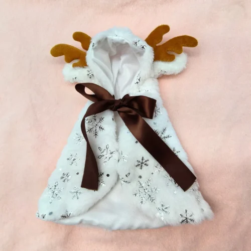 This is our white reindeer antlers dog cape. It’s a soft, fluffy white hooded design covered in sparkling silver snowflake patterns, with cute brown velvet antlers on the hood and a large elegant brown satin bow tied at the front. It keeps your pup cozy and looking beautifully festive for the holidays.