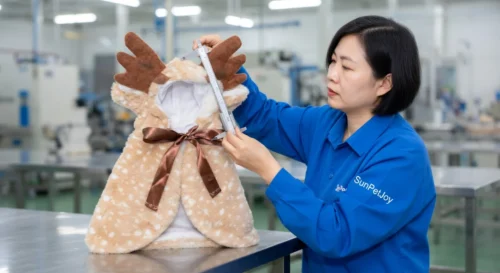 This is our verification and quality control inspection on the finished Reindeer Antlers Dog Costume, confirming dimensional accuracy and overall integrity to provide reliable, consistent products for wholesale distribution.