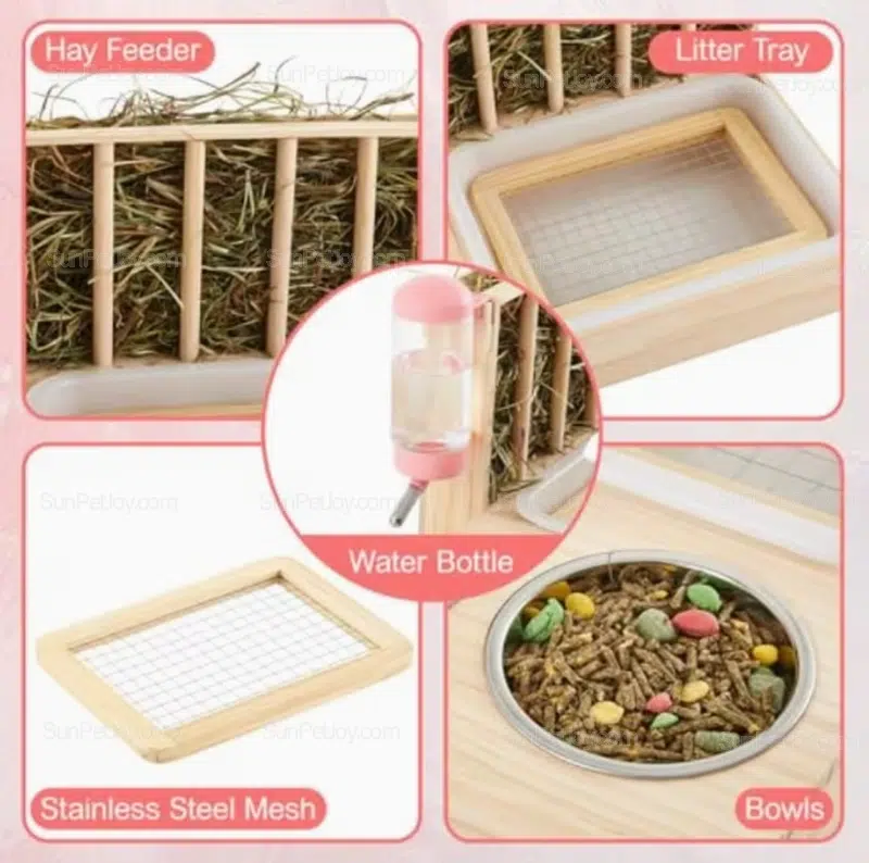 | Main Components | Hay feeder, water bottle holder, 2 bowls, removable litter tray, mesh insert |