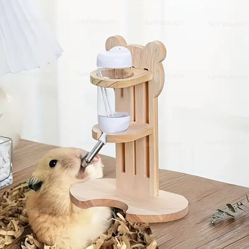 The solid wooden stand supports gravity-style water bottles without cage mounting, making it suitable for tabletop enclosures, retail displays, and modular habitat setups.
