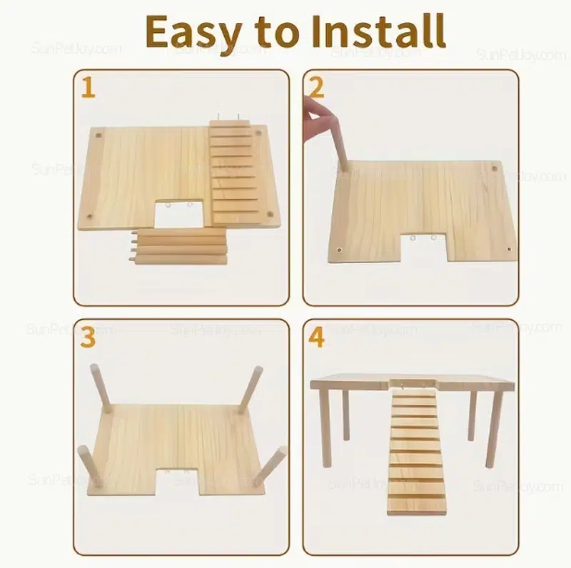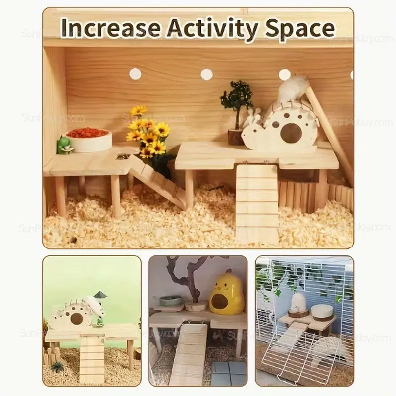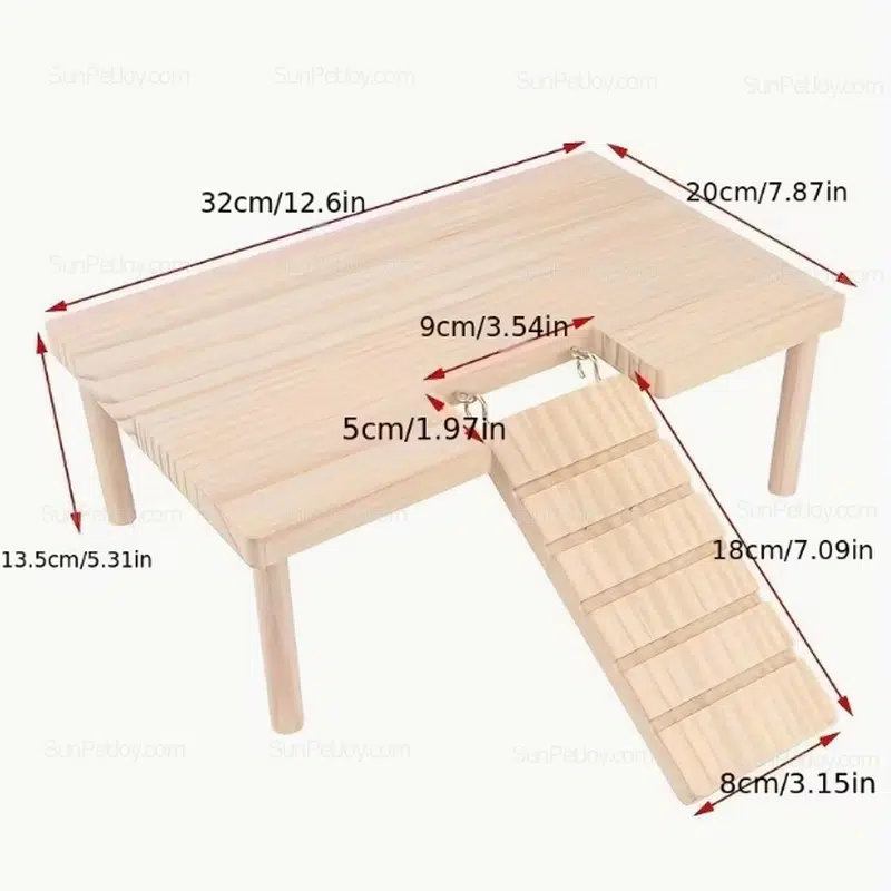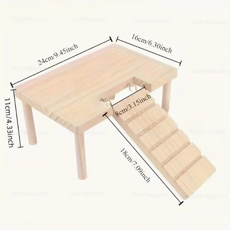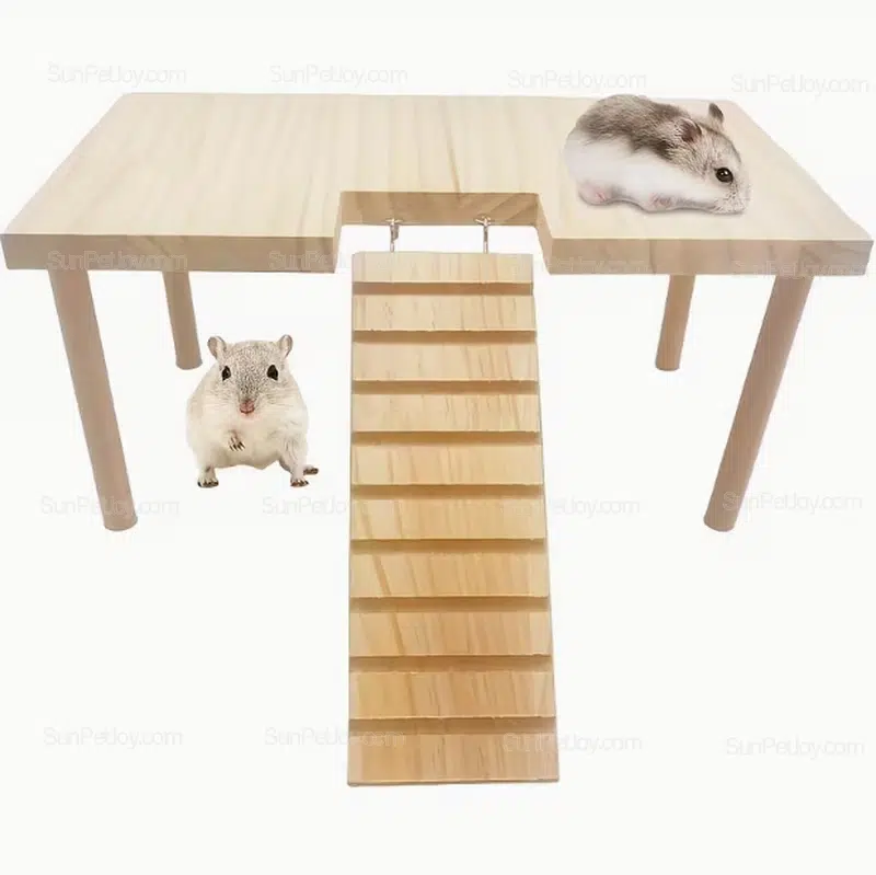 This Small Animals wooden habitat platform is designed for professional cage setup projects, helping brands and distributors expand usable vertical space inside enclosures. Made from solid natural wood, it integrates a stable platform and ramp structure, supporting daily activities such as feeding, resting, climbing, and observation for small animals.