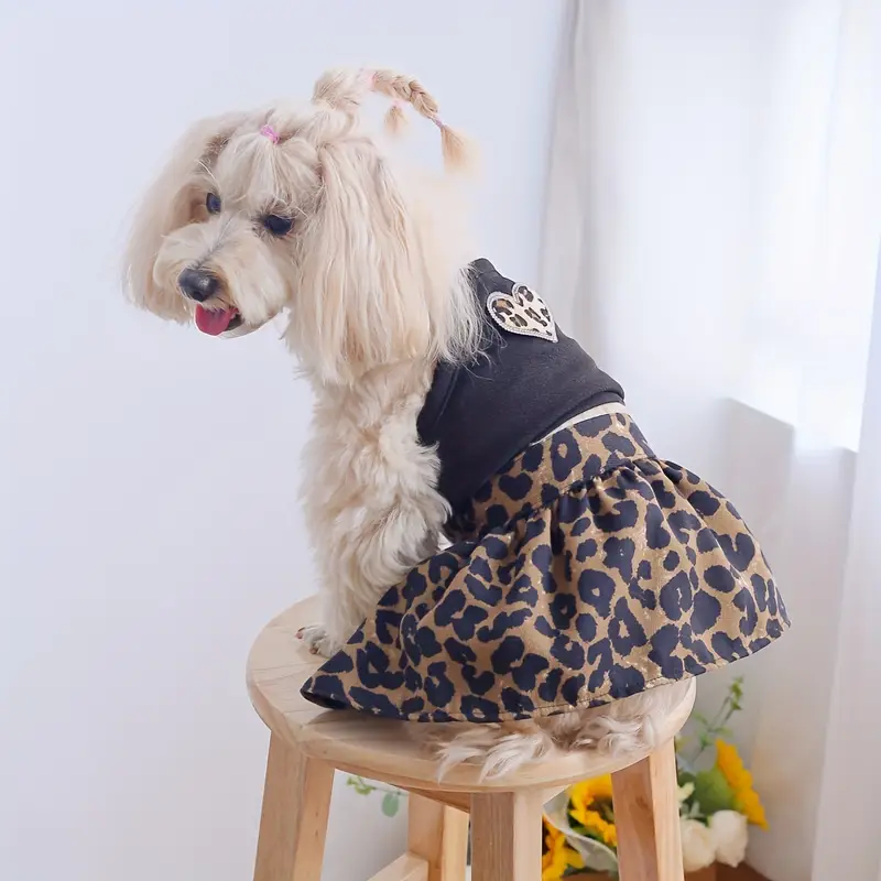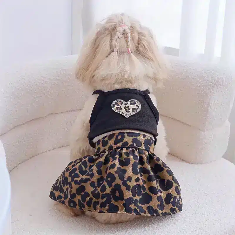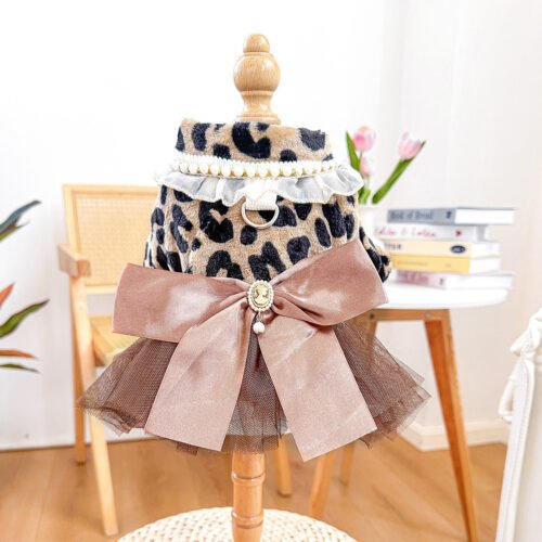 This is our leopard print luxury dog dress, designed with a soft plush leopard-pattern top, delicate ruffle trim at the neckline, a large satin bow with an elegant decorative charm, and a layered mesh skirt that gives it a fashionable and premium boutique look. We can customize the print style, bow color, trim details, skirt volume, fabric materials, and brand labels to create a unique design for your collection.