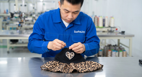 This is our final assembly step where experienced workers attach decorative accents to loose fit pet dog sweaters with careful precision, supporting superior quality and dependable wholesale supply.
