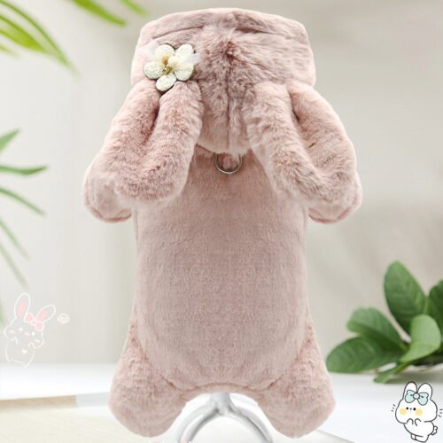 This is our soft bunny-style dog jumpsuit, designed with a plush pink body, long floppy ears on the hood, and a delicate flower decoration that gives it a sweet and cozy look for autumn and winter collections. We can customize the color, ear shape, hood decoration, fabric, size range, and branding details to create your own exclusive pet apparel style.
