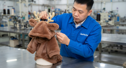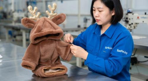 This is our specialized stitching phase where we precisely attach the hood and ear components to our small dog hoodies, maintaining design accuracy and structural integrity for dependable wholesale supply.
