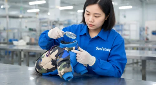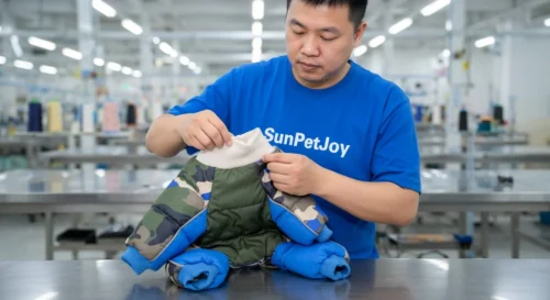 This is our rigorous quality control inspection where experts verify seams and construction on finished small dog snowsuits, upholding strict standards for consistency and long-term product excellence.