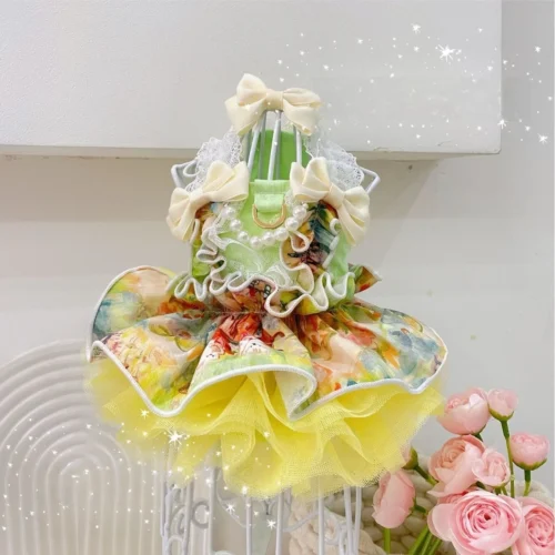 This is our vibrant floral dog wedding dress. It features a bright lime-green bodice with colorful watercolor floral prints, a full layered yellow tulle skirt with ruffled edges, delicate white lace trim, multiple cream satin bows, and pretty pearl accents for a playful fairy-tale princess look.