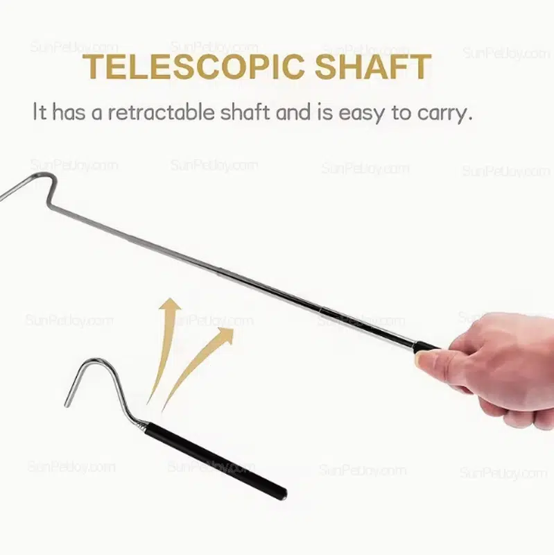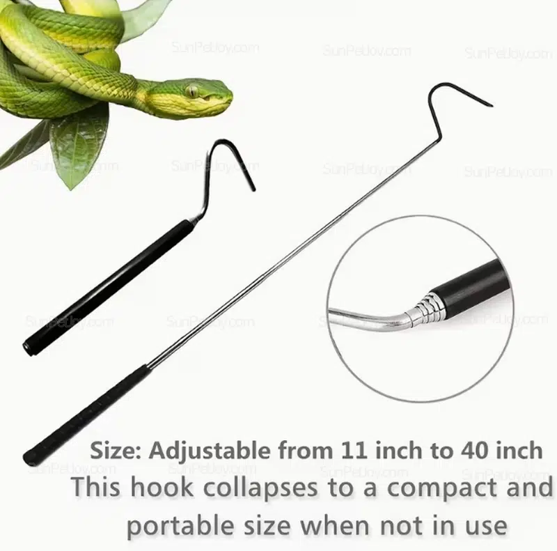 The adjustable telescopic structure extends from a compact 11 inches to a full working length of approximately 39–40 inches, helping keep a safe operating distance when handling medium to large snakes. A non-slip rubber grip improves control during prolonged use, while the smooth hook surface minimizes stress and pressure on the animal.
