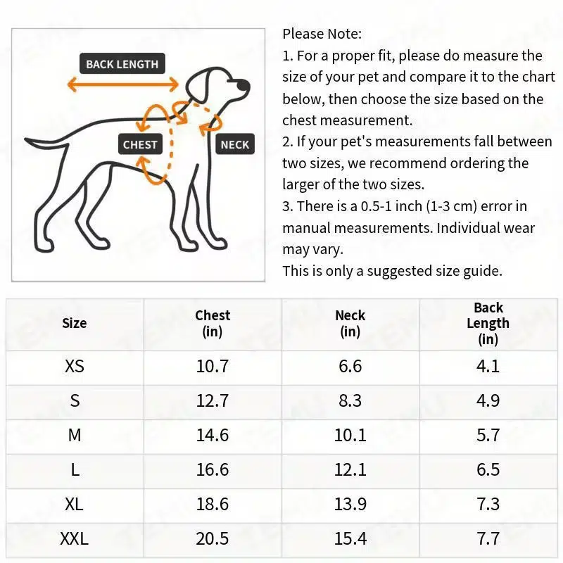 | Size | Chest (in / cm) | Neck (in / cm) | Back Length (in / cm) |