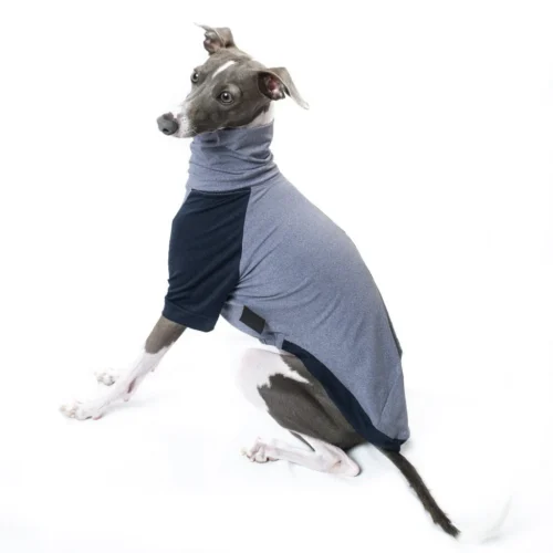 This is our sleek gray and navy blue color-blocked sun protection shirt for dogs. It features a cozy high turtleneck collar for maximum neck coverage, stylish two-tone design with a short sleeve, and a comfortable stretch fit that shields your pup from harmful UV rays while keeping them looking effortlessly cool. We can customize this style with different color combinations, fabrics, lengths, or any modifications you’d like to perfectly match your needs.