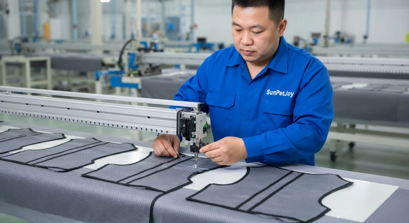 This is our automated precision cutting process for polyester mesh fabric used in our thunder shirts for dogs. Expert operation ensures exact patterns, dimensional accuracy, and consistent sizing for reliable wholesale supply.