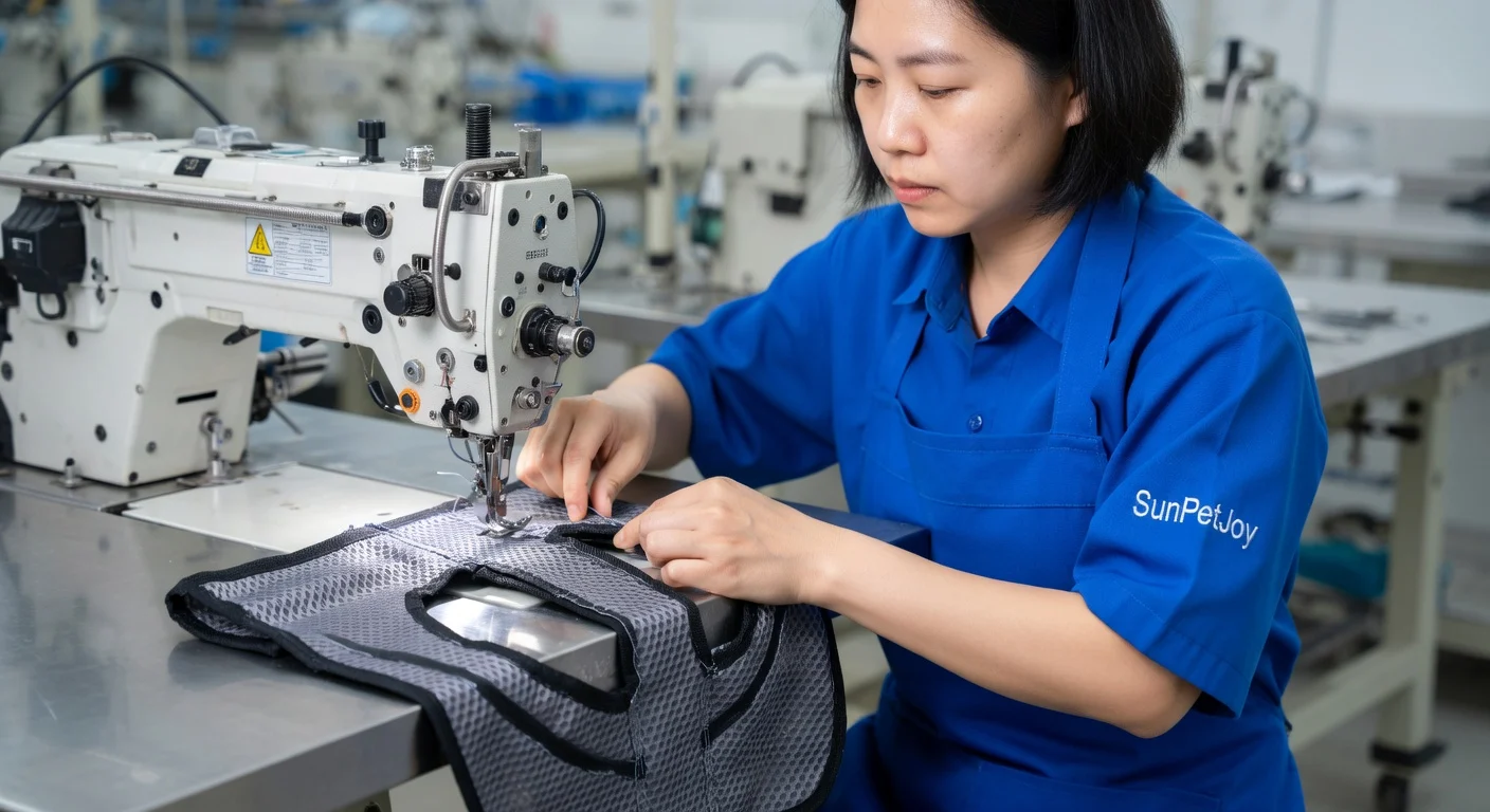 This is our industrial sewing stage utilizing overlock techniques to create reinforced seams on breathable mesh thunder shirts for dogs. This delivers superior durability, quality control, and dependable performance across bulk wholesale orders.
