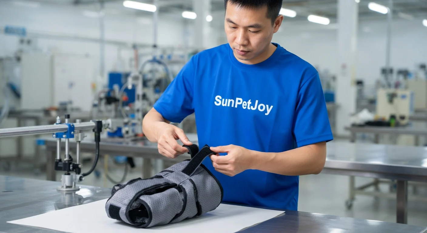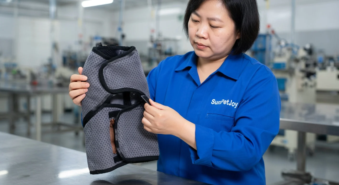This is our rigorous final quality inspection verifying seam integrity and velcro function on completed thunder shirts for dogs. This step upholds precision standards and ensures reliable batch consistency for wholesale partners.