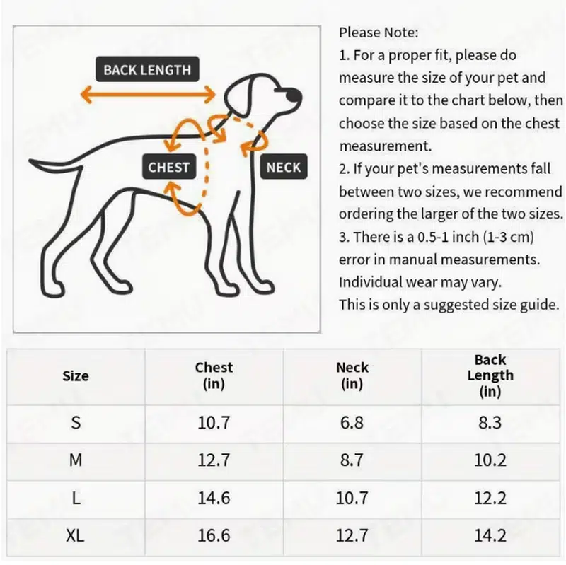 | Size | Chest (in) | Neck (in) | Back Length (in) |