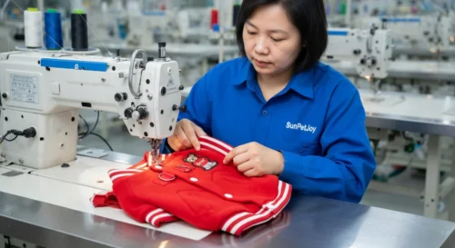 This is our sewing assembly stage where experienced operators precisely join fabric panels and integrate striped collar sections, maintaining strict quality control for durable and consistent wholesale pet apparel.