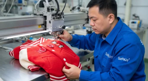This is our embroidery application step where trained specialists use advanced equipment to accurately apply the bear pattern, delivering precise detailing and uniform quality across all wholesale warm dog jackets.