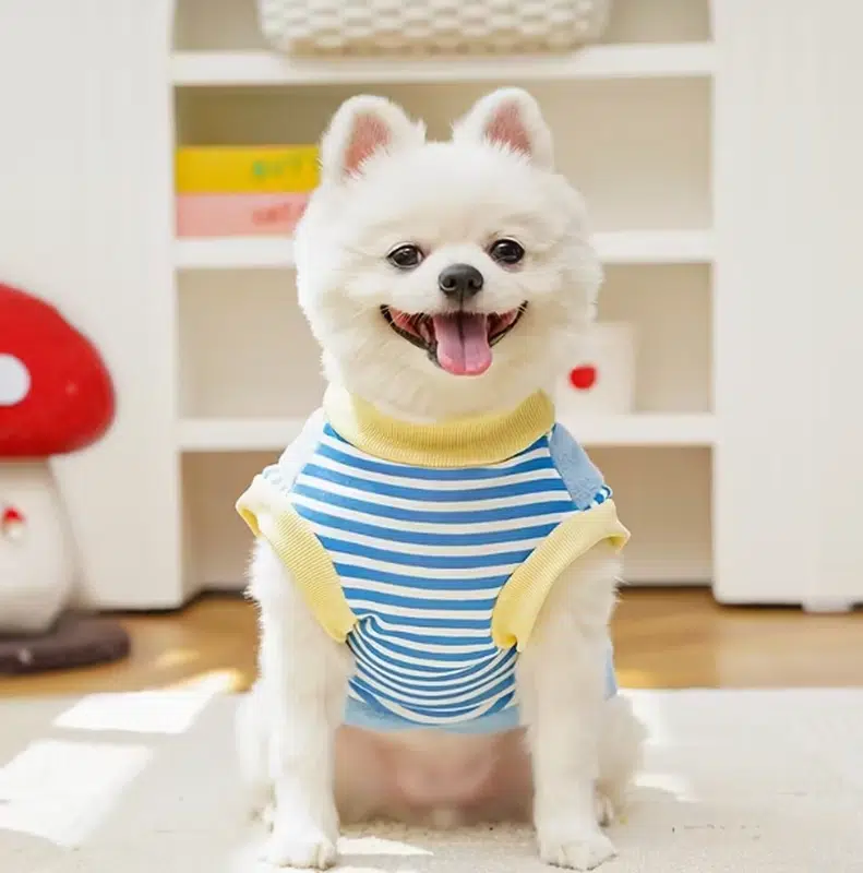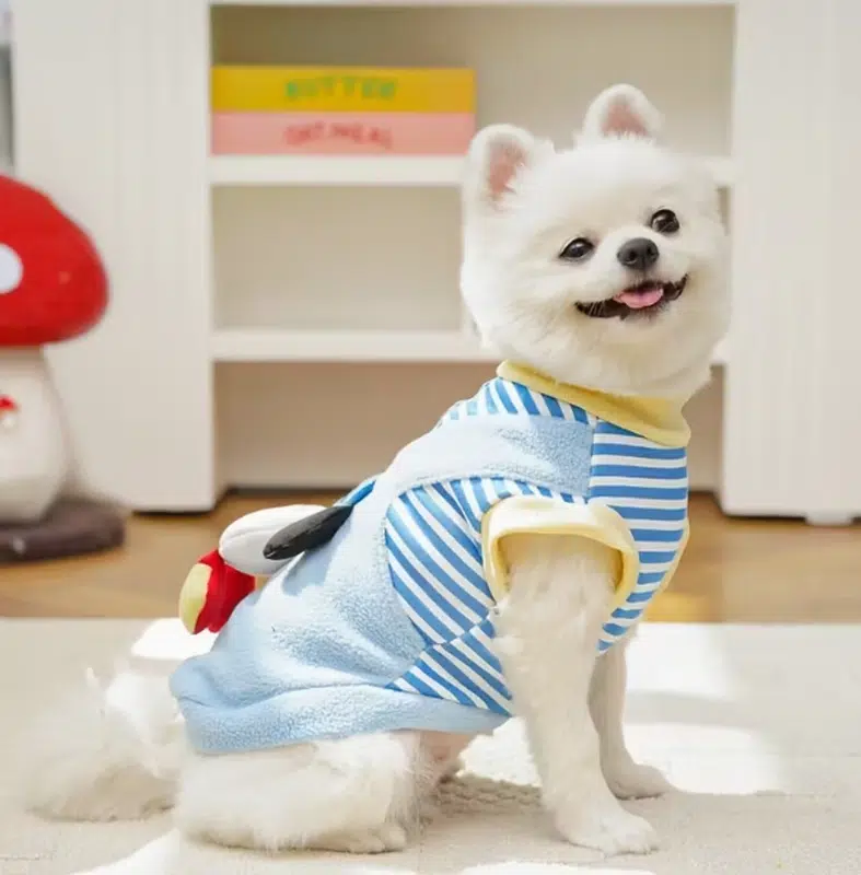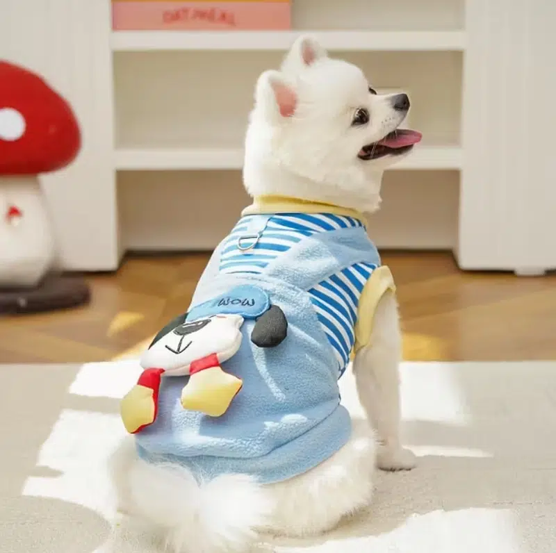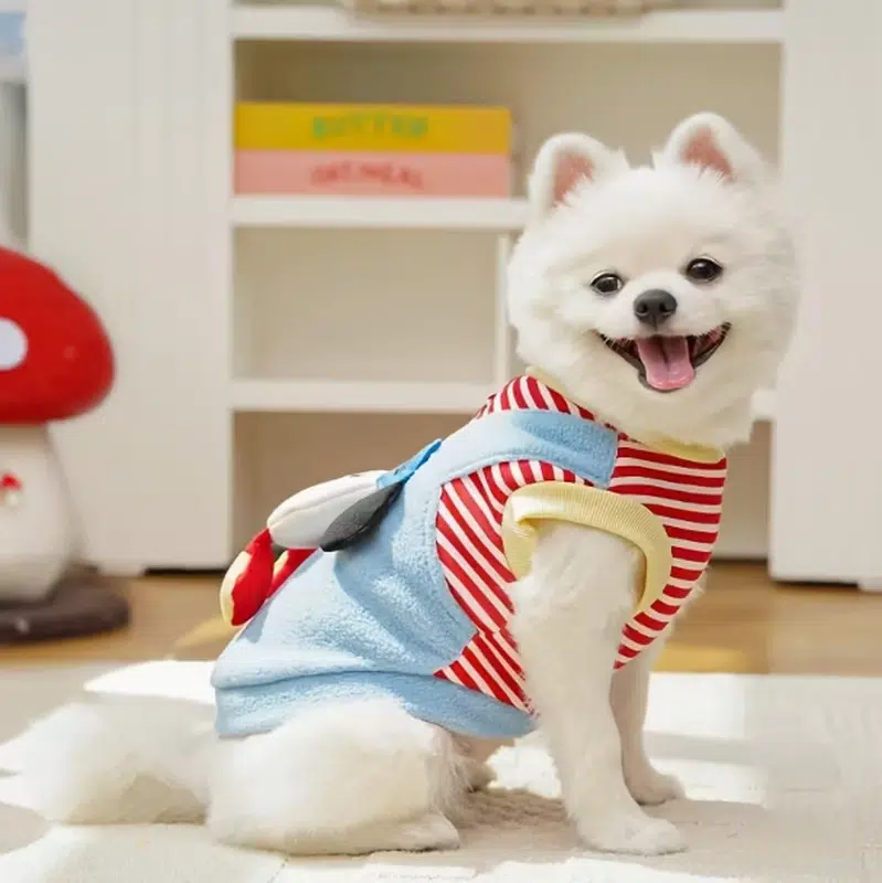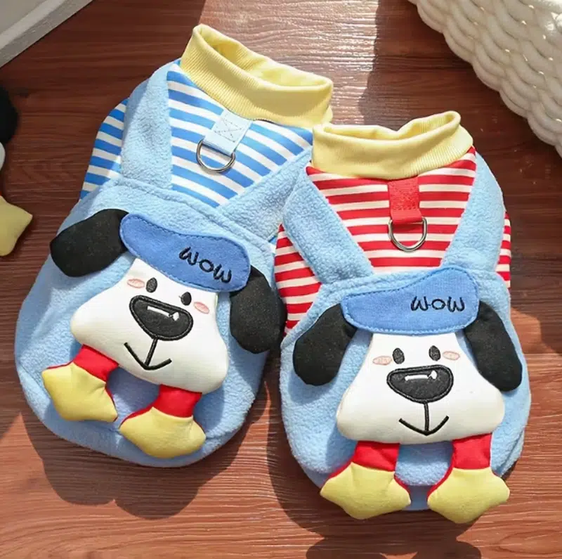This warm dog vest features a durable polyester construction with a striped upper section in red-white or blue-white, seamlessly spliced to a light blue suspender skirt. It includes a charming 3D dog figure on the back and a sturdy metal traction ring for secure leash attachment. Tailored for B2B buyers like pet stores, e-commerce sellers, and wholesalers, this vest supports retail scenarios where pet owners demand functional apparel that offers reliable coverage and walking convenience. Its precise sizing from XS to 8XL minimizes returns, ensures a secure fit, and drives inventory turnover through broad compatibility with small to large dog vest breeds.