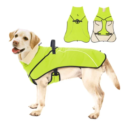 This is our high-visibility reflective dog coat, made for dogs who need better outdoor protection with a bright safety color, reflective piping, soft collar lining, and a practical built-in harness-style structure. We can customize this style with different colors, reflective details, lining materials, strap designs, logo printing, and size options for your brand.