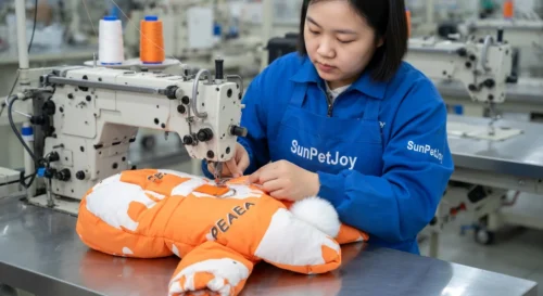 This is our seam assembly stage using industrial sewing machines to create reinforced seams on the dog puffer jacket. Precision stitching delivers superior durability and batch consistency for wholesale reliability.
