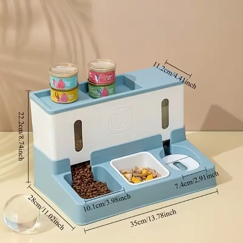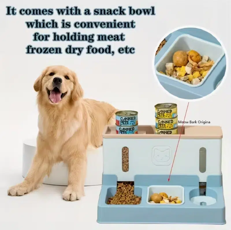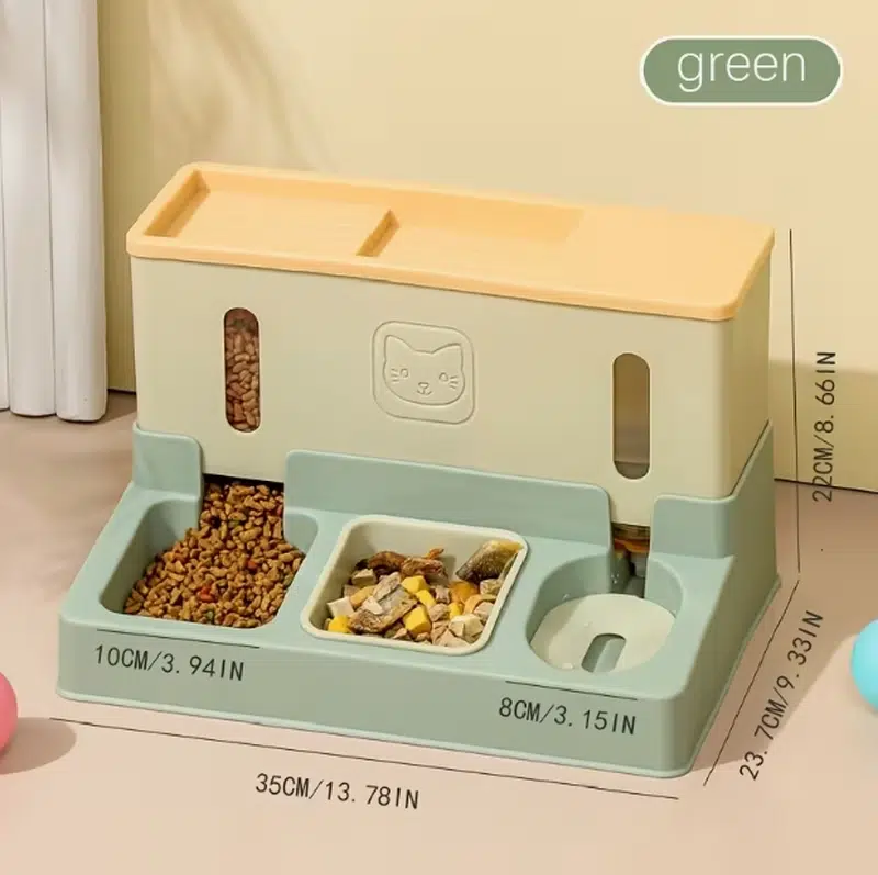 - 3-in-1 design: dry food feeder, snack bowl, and water dispenser in one unit