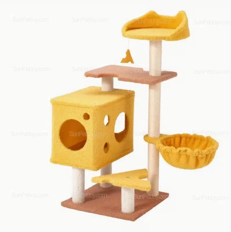 Discover the SUNPETJOY Cheese Cat Tower, a playful 37-inch multi-level cat tree designed for small felines. Crafted with durable sisal scratching posts and a cozy hammock, this indoor cat playground in light brown and yellow tones offers endless fun. Ideal for pet retailers seeking wholesale cat furniture, our OEM services allow custom sizes, colors, and features to match your brand.