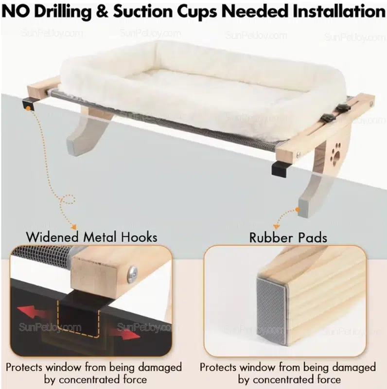 Ideal for B2B partnerships, our cat hammock supports easy no-drill installation on windowsills or bedsides. With secure metal hooks and rubber pads, it ensures safety while holding up to 55 lbs—perfect for cats of all sizes.
