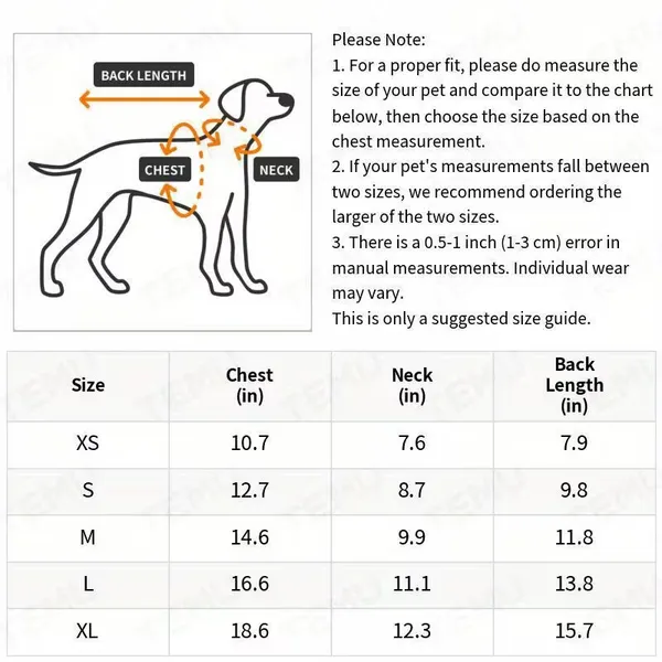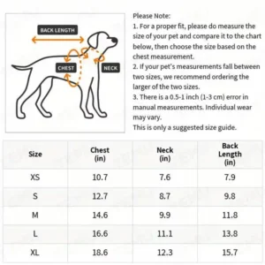 | Size | Chest (in) | Neck (in) | Back Length (in) |