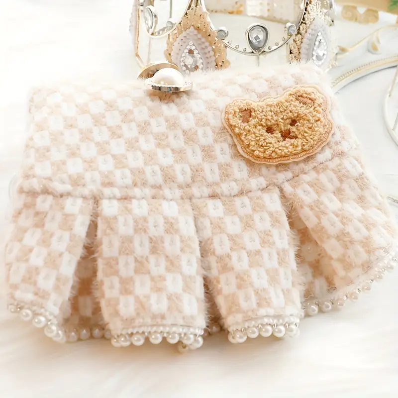 - Design: Beige plaid, pearl accents, embroidered bear, frilled skirt