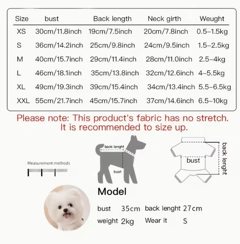 | Size | Bust | Back Length | Neck Girth | Weight |