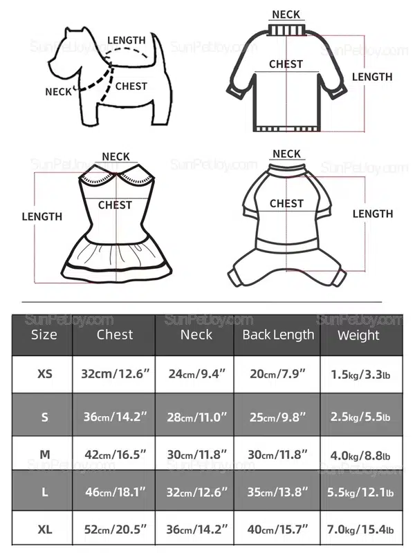 | Size | Chest | Neck | Back Length | Recommended Weight |