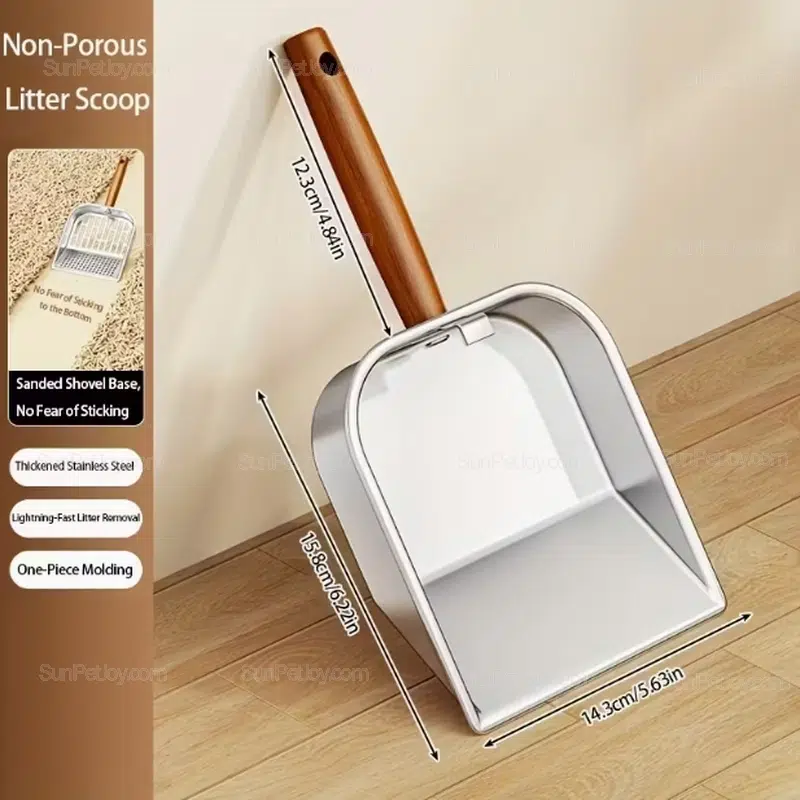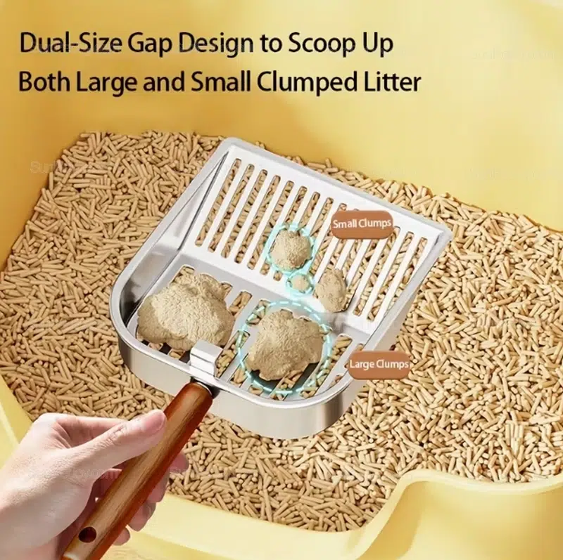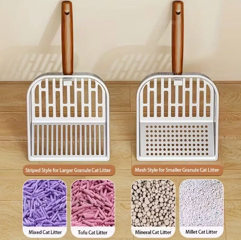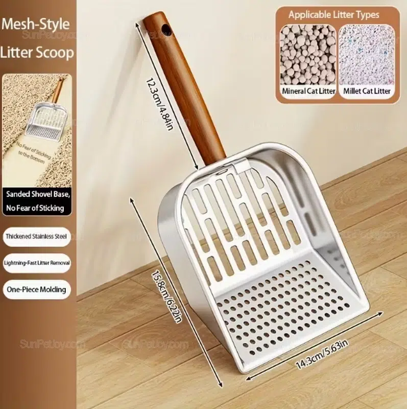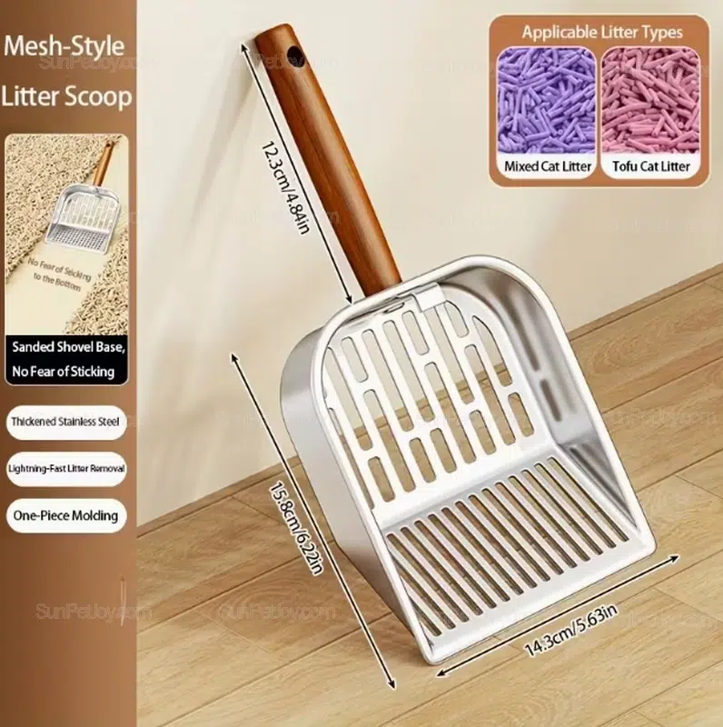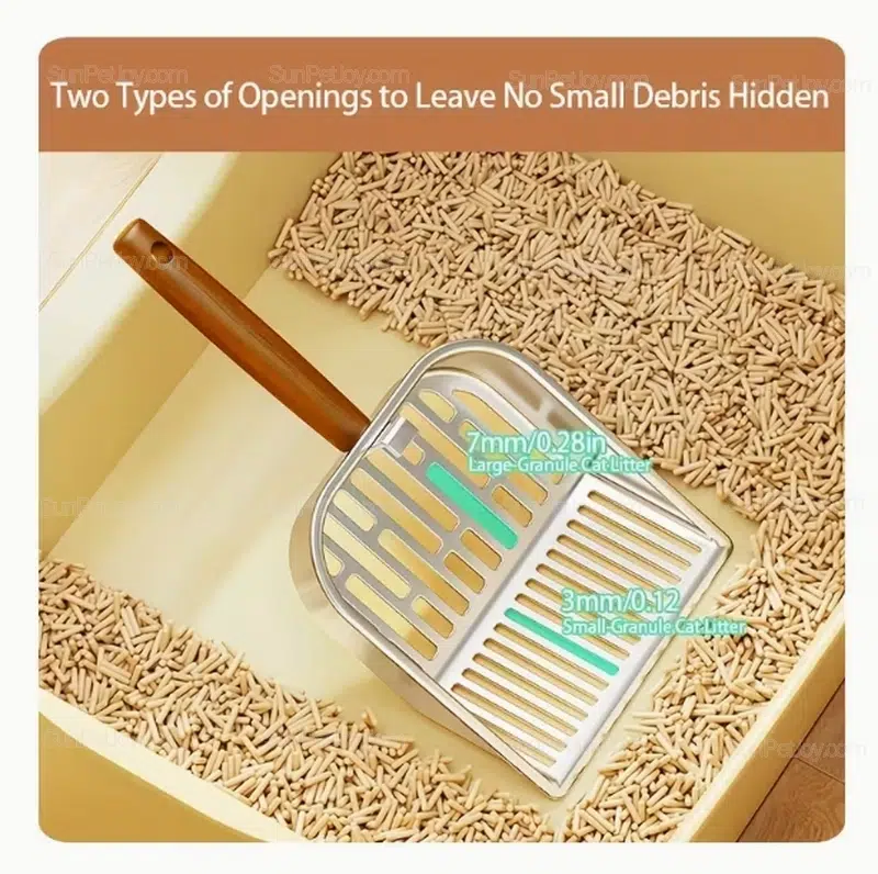 Unlike single-gap scoops that either waste clean litter or miss small fragments, this design helps reduce litter loss and keeps boxes cleaner with fewer repeats. The scoop body is made with thickened stainless steel and a smooth, sanded shovel base to reduce sticking and make rinse-off faster. A hanging hole / storage hook option supports merchandising walls, warehouse picking stations, and compact back-room storage.