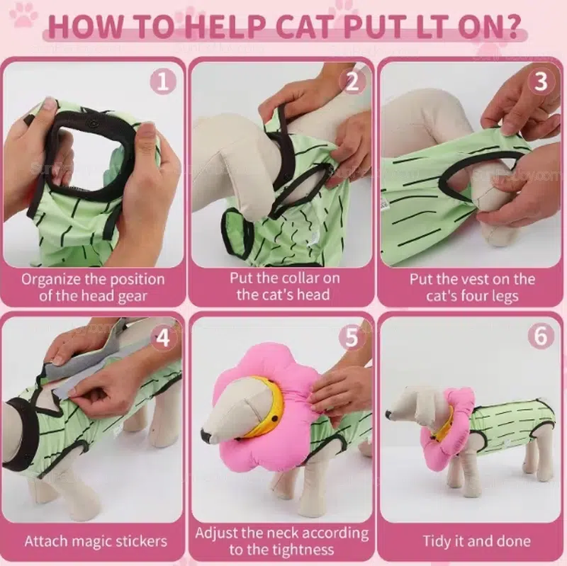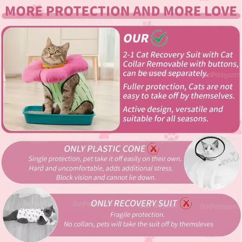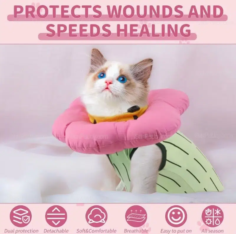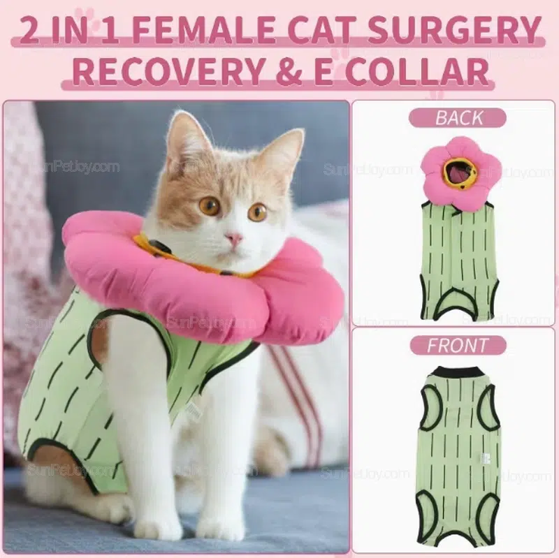 Discover our innovative 2-in-1 cat recovery suit, designed as a gentle alternative to traditional plastic cones. This breathable spay suit combines a snug fit with a detachable soft flower-shaped collar, offering superior post-surgery cat protection for female felines recovering from procedures.