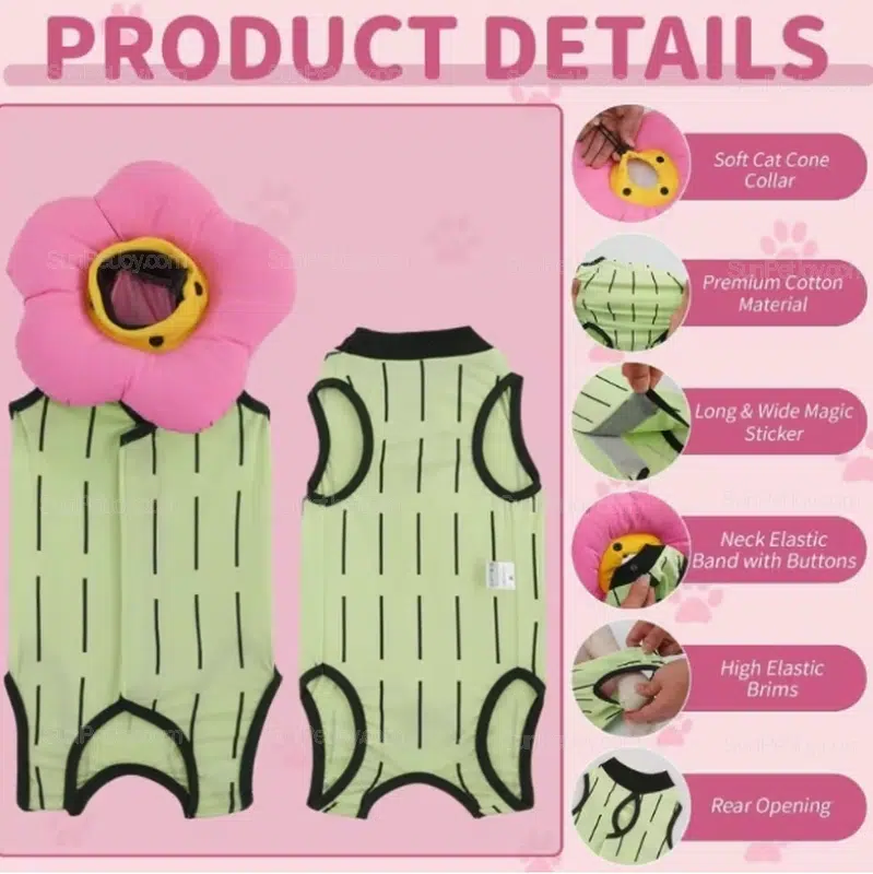 In real-world scenarios, pet owners use this during spay recoveries, where the adjustable design allows cats to eat, play, and use litter boxes without hindrance. One bulk buyer shared: “Our customized green versions flew off shelves—clients love the cactus pattern for its fun yet functional vibe.”