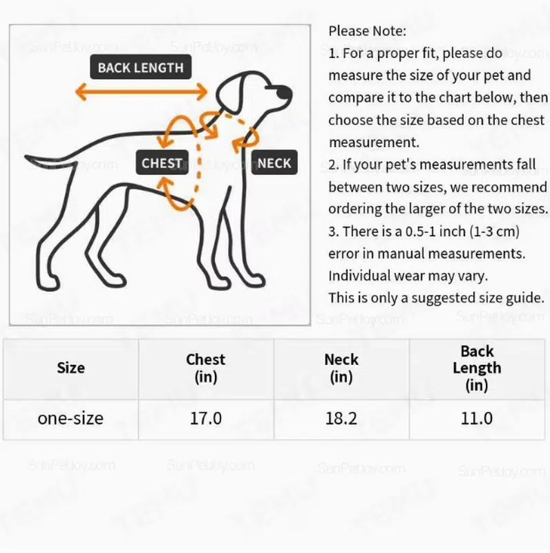 | Size | Chest (in) | Neck (in) | Back Length (in) |