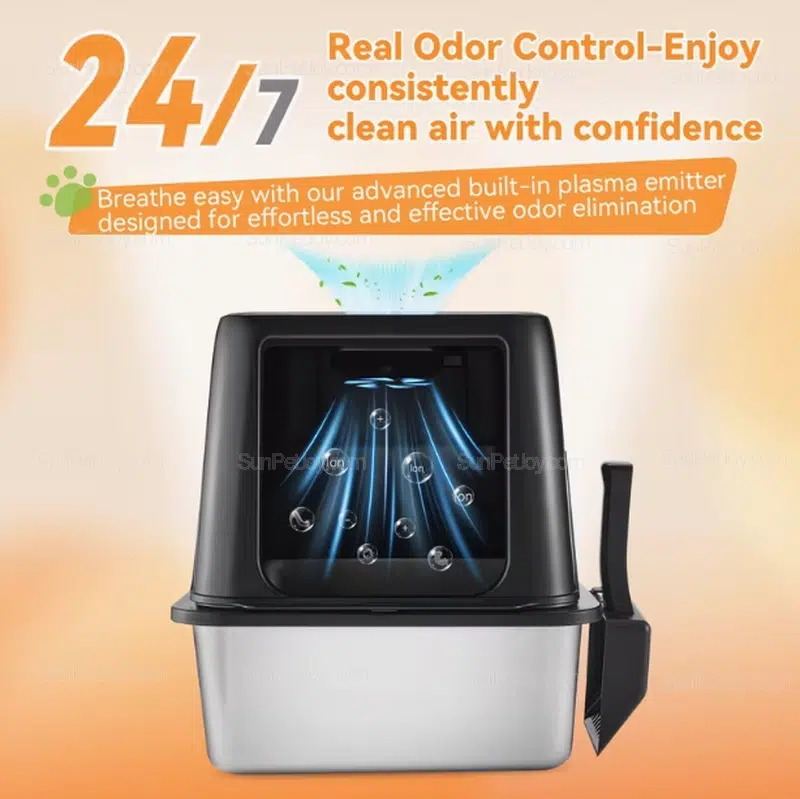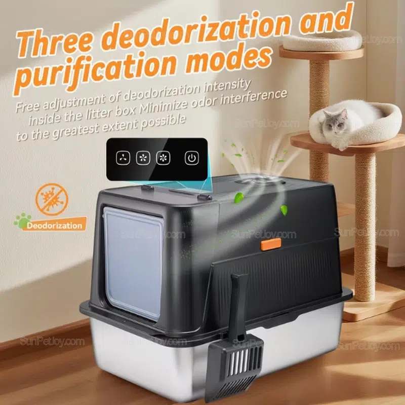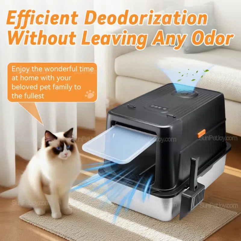 Designed for professional pet brands and distributors, this enclosed cat litter box combines a stainless steel pan with an electric odor control system. It is built for multi-cat households, high-traffic retail environments, and long-term commercial use where durability, hygiene, and odor management matter most.