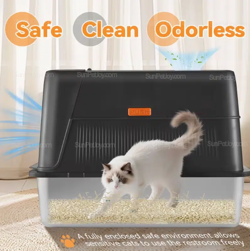 - Fully enclosed structure reduces litter tracking and odor leakage