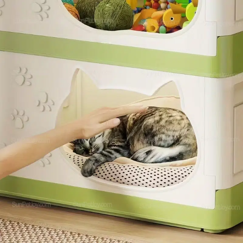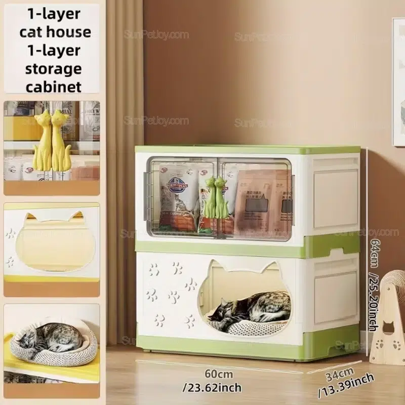 This wholesale cat storage cabinet is designed as a dual-function solution that combines an enclosed cat house with organized storage space.
