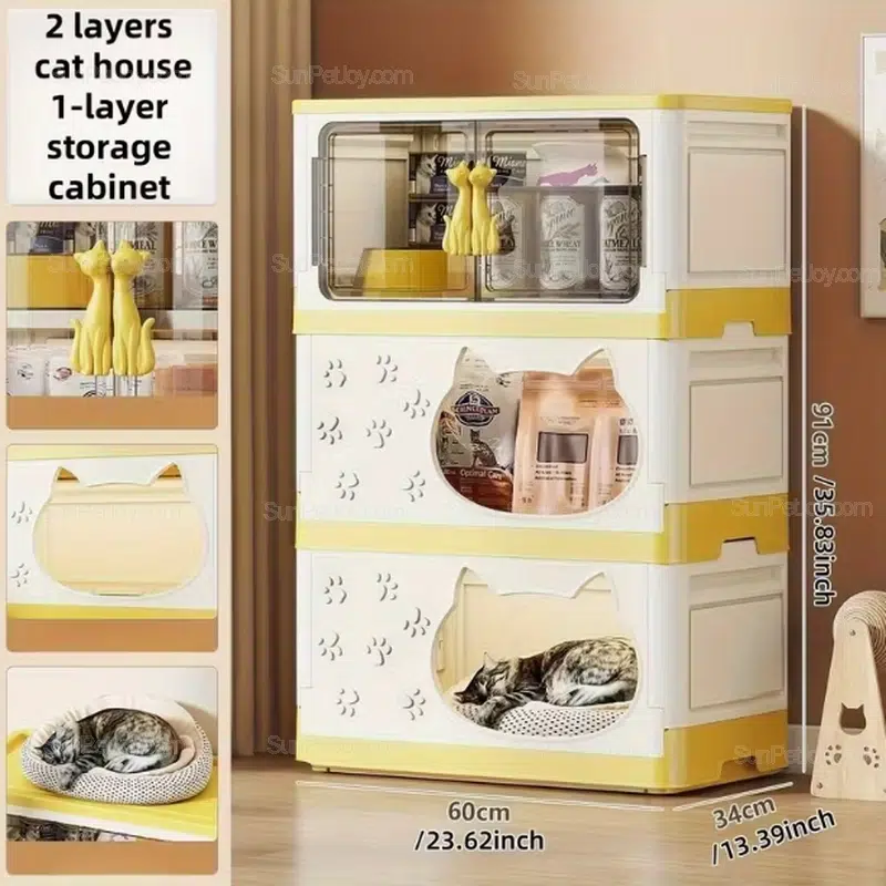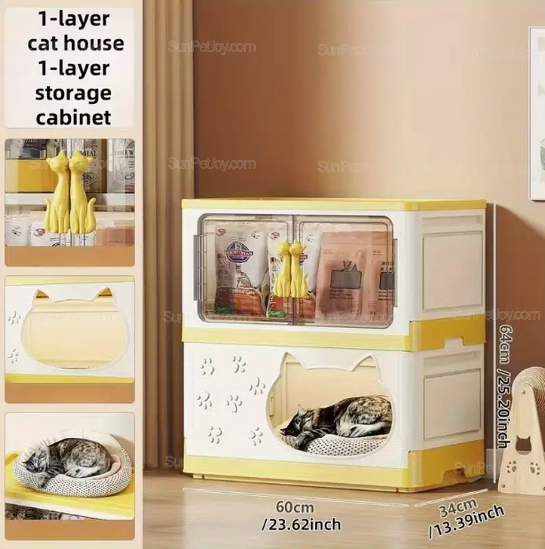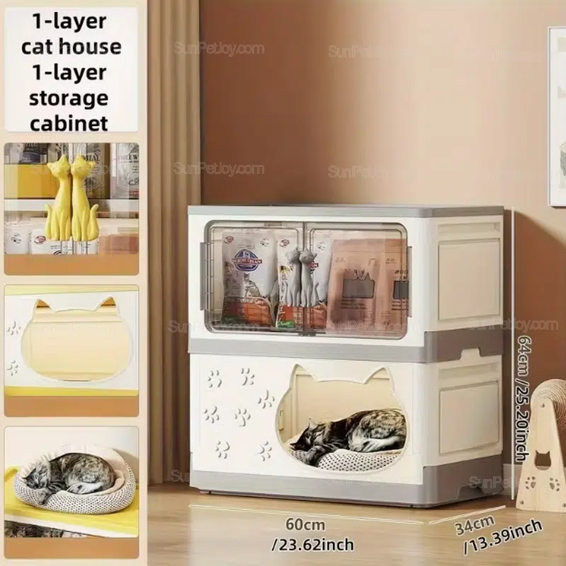 The upper compartment is commonly used for cat litter, toys, grooming tools, or packaged pet supplies, while the lower enclosed space functions as a quiet cat house.
