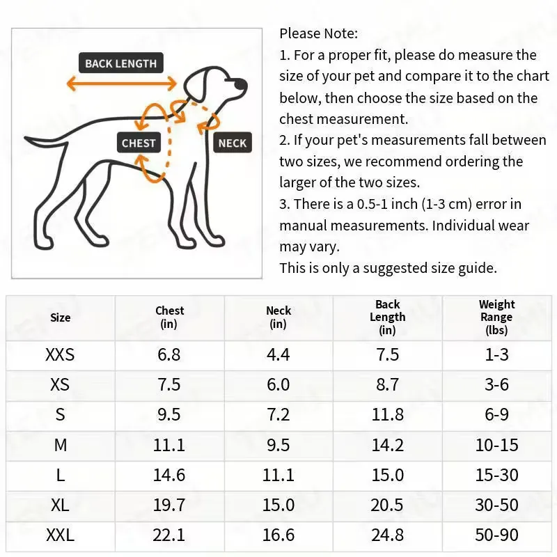 | Size | Chest (cm/in) | Length (cm/in) | Neck (cm/in) | Weight (lbs) |