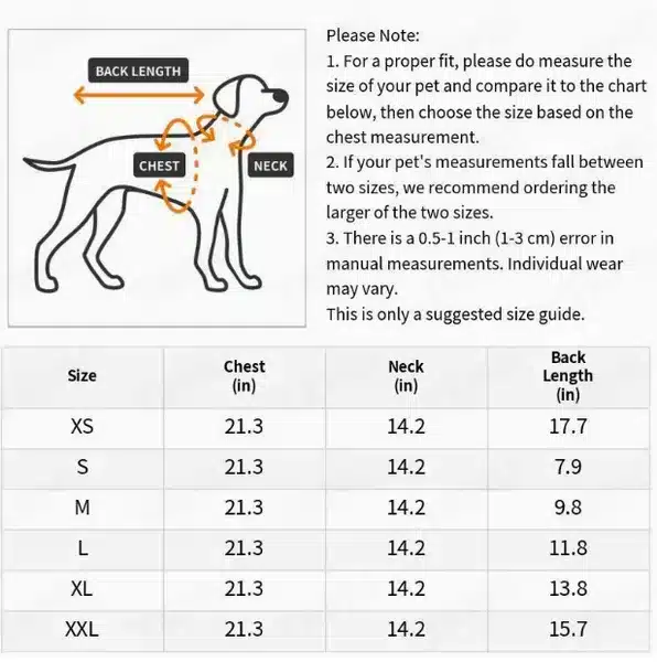 | Size | Chest (in) | Neck (in) | Back Length (in) |