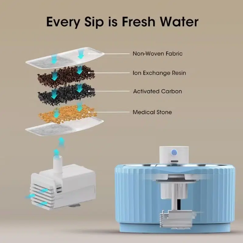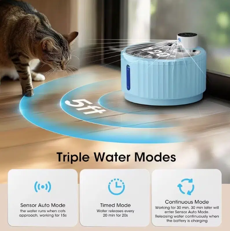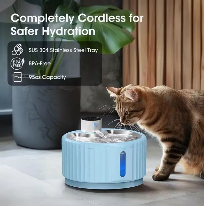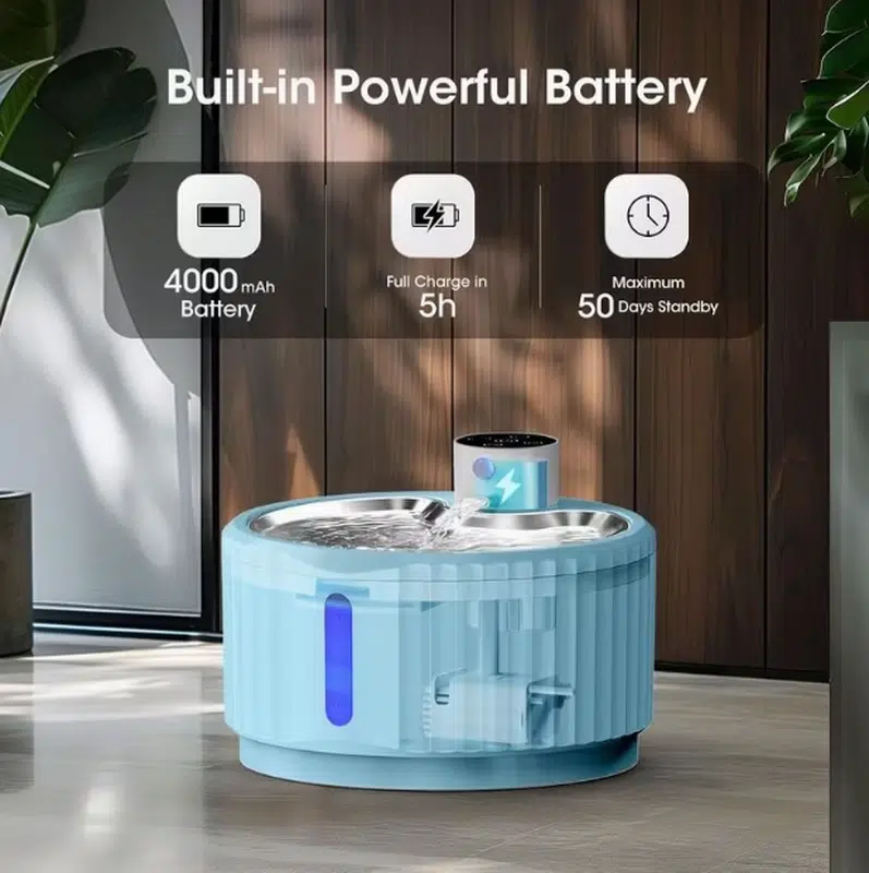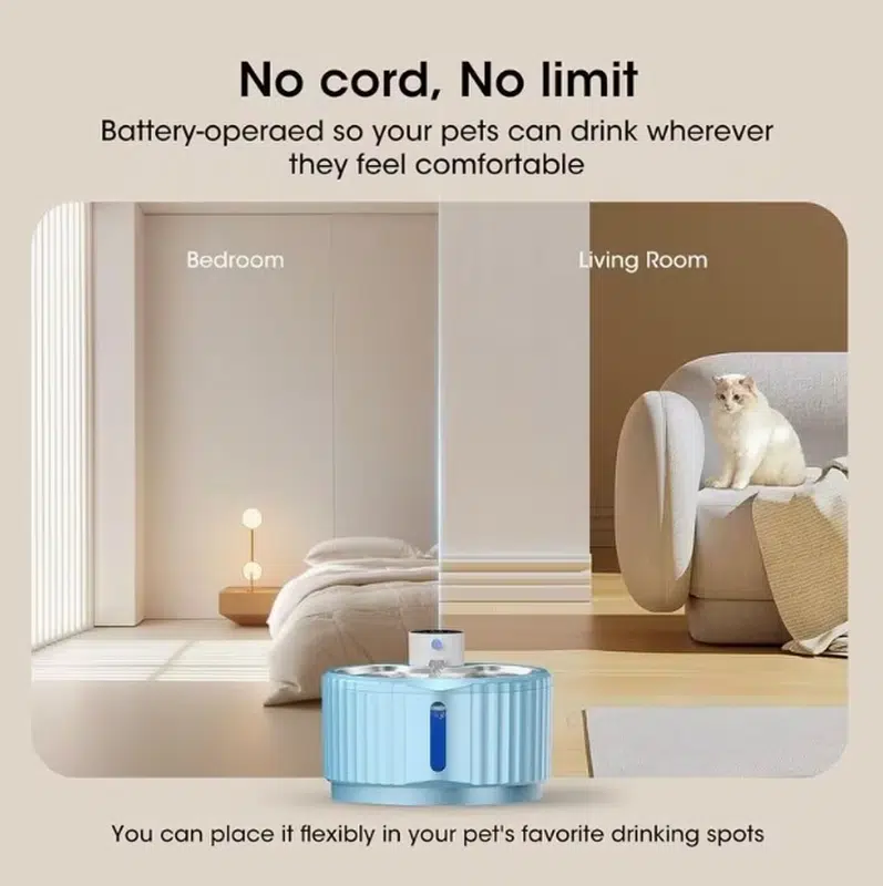 Its wireless structure allows placement in bedrooms, living rooms, pet corners, or retail display settings without electrical constraints. The stainless steel drinking tray enhances hygiene control, making it suitable for multi-pet households and professional pet product lines.