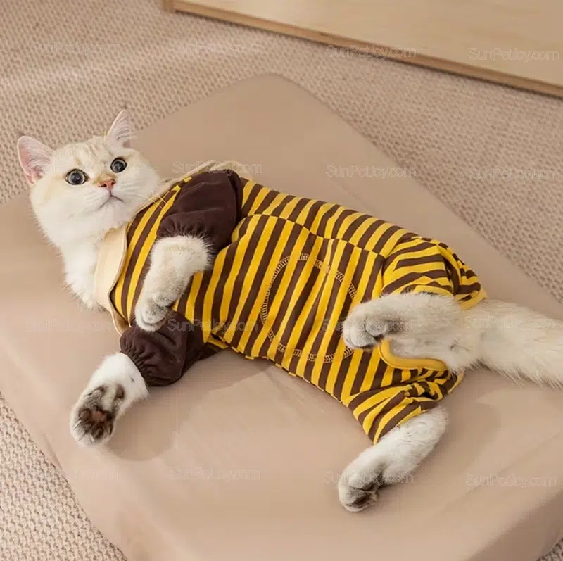 Discover our bee-striped cat winter onesie, designed for warmth and style in chilly seasons. This all-in-one jumpsuit features soft, striped fabric with a playful bee collar, ideal for keeping kittens and adult cats cozy during indoor lounging or outdoor adventures. Perfect for pet brands seeking unique cat apparel that stands out in the market.